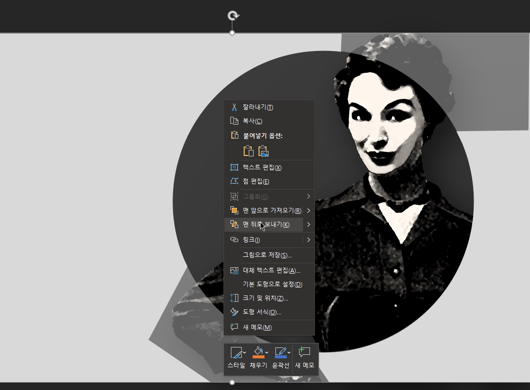 9. 구멍이 나지 않은 원본 도형(4번단계)을 선택한 뒤 우클릭→맨 뒤로 보내줍니다.