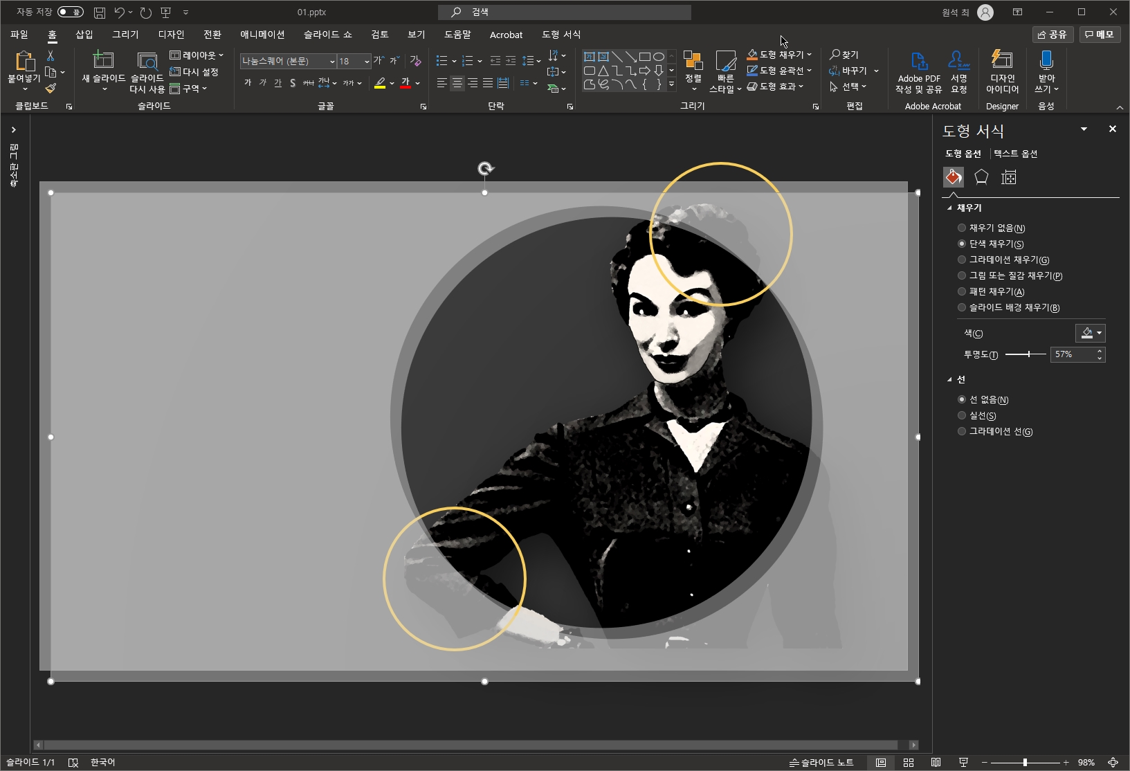 - 위 사진처럼 임시로 도형의 투명도를 살짝 투명하게 준 상태로 작업하시면 수월합니다